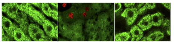 左图:正常肝细胞;中图:肝脏部分切除后;右图:肝脏部分切除后使用新药物治疗,肝脏再生