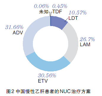 2012年,中国乙肝随访与临床科研平台(CR-HepB)建立,其数据库于2014年12月1日更新的数据显示,在此平台登记进行长期随访和被纳入临床研究的超过65213例的患者中,约70%仍在接受非一线抗病毒治疗(图2),这已成为中国HBV感染治疗临床实践中一个非常严峻的问题。