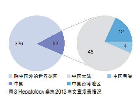 2013年《肝脏病学》(Hepatology)杂志所发表的论著文章中,有46篇来自中国大陆学者,仅次于美国(图3)。