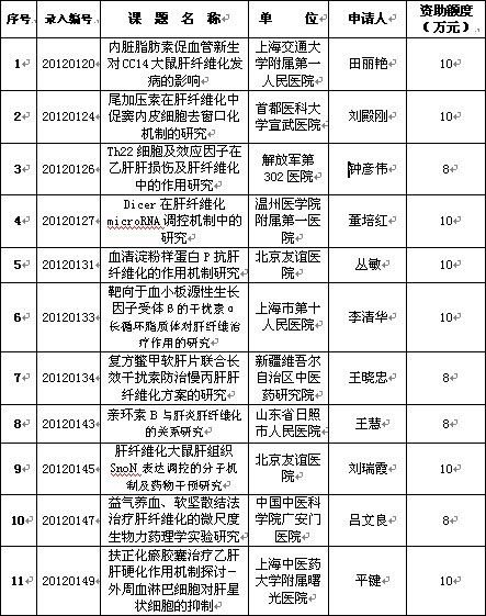 2012年度王宝恩肝纤维化研究基金资助课题一览表