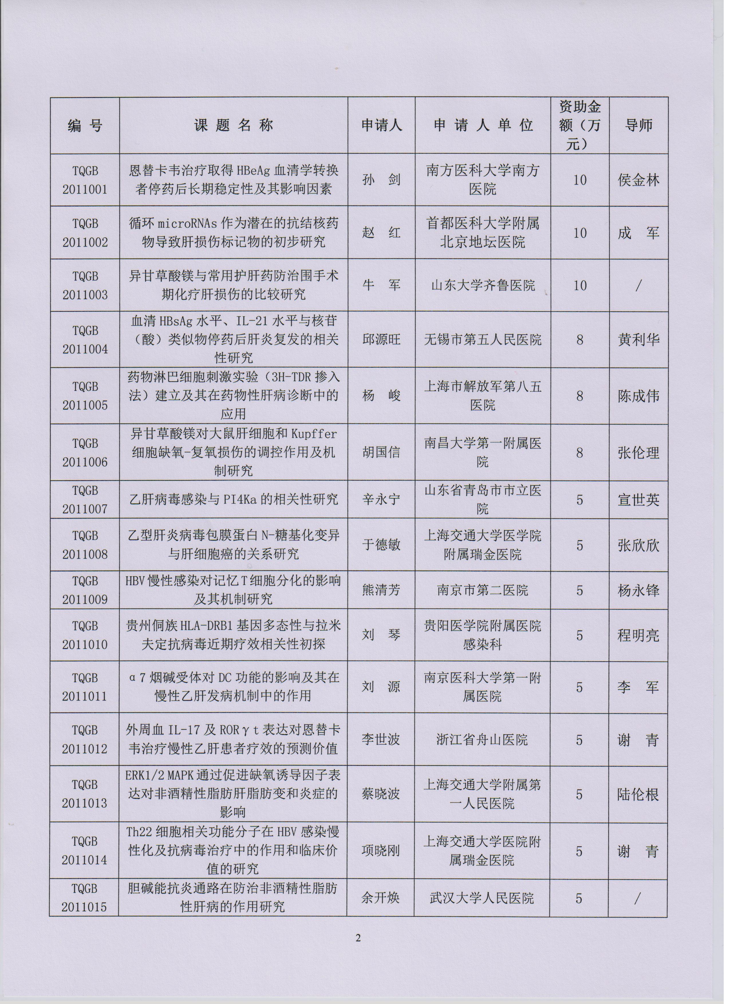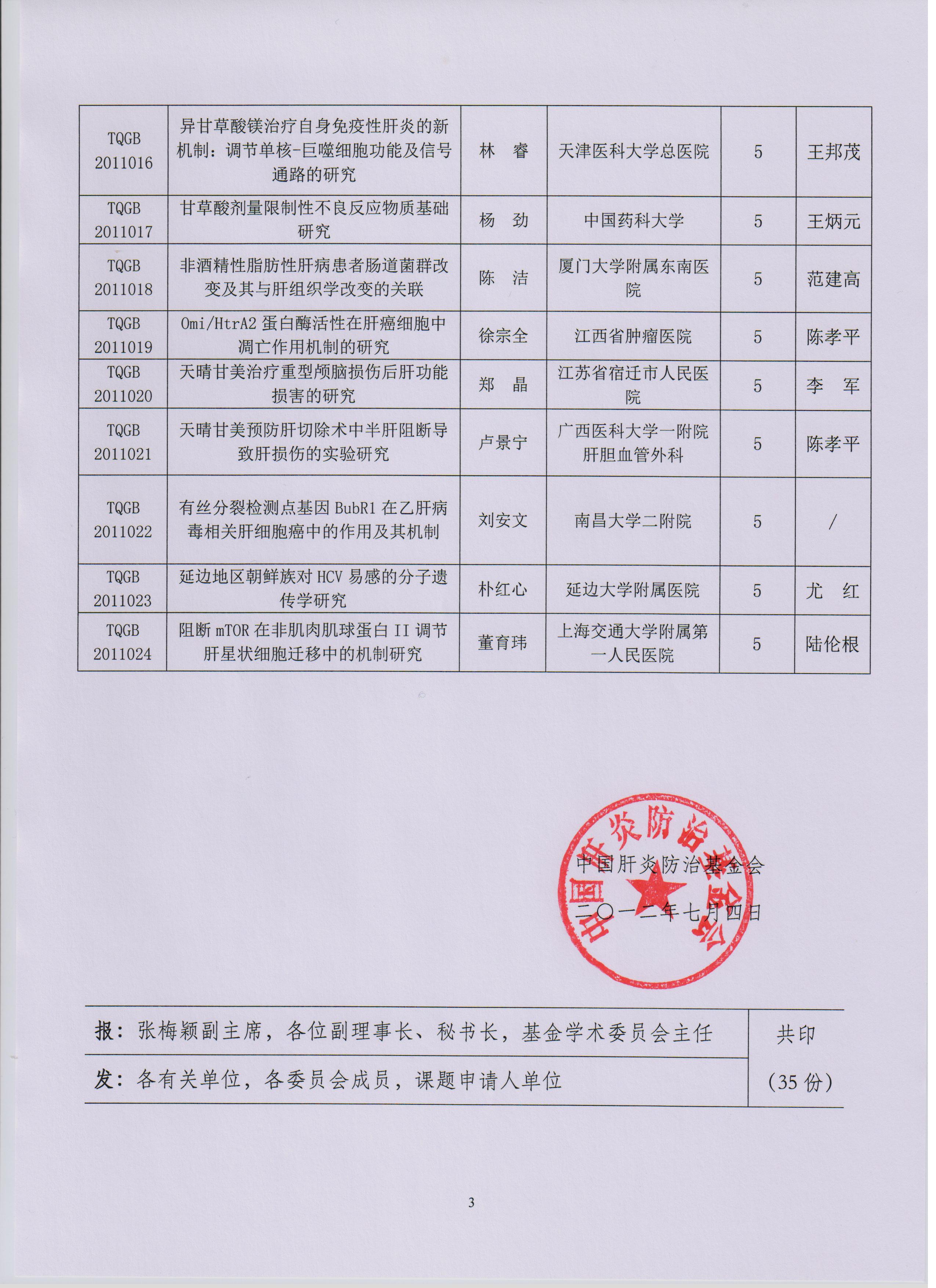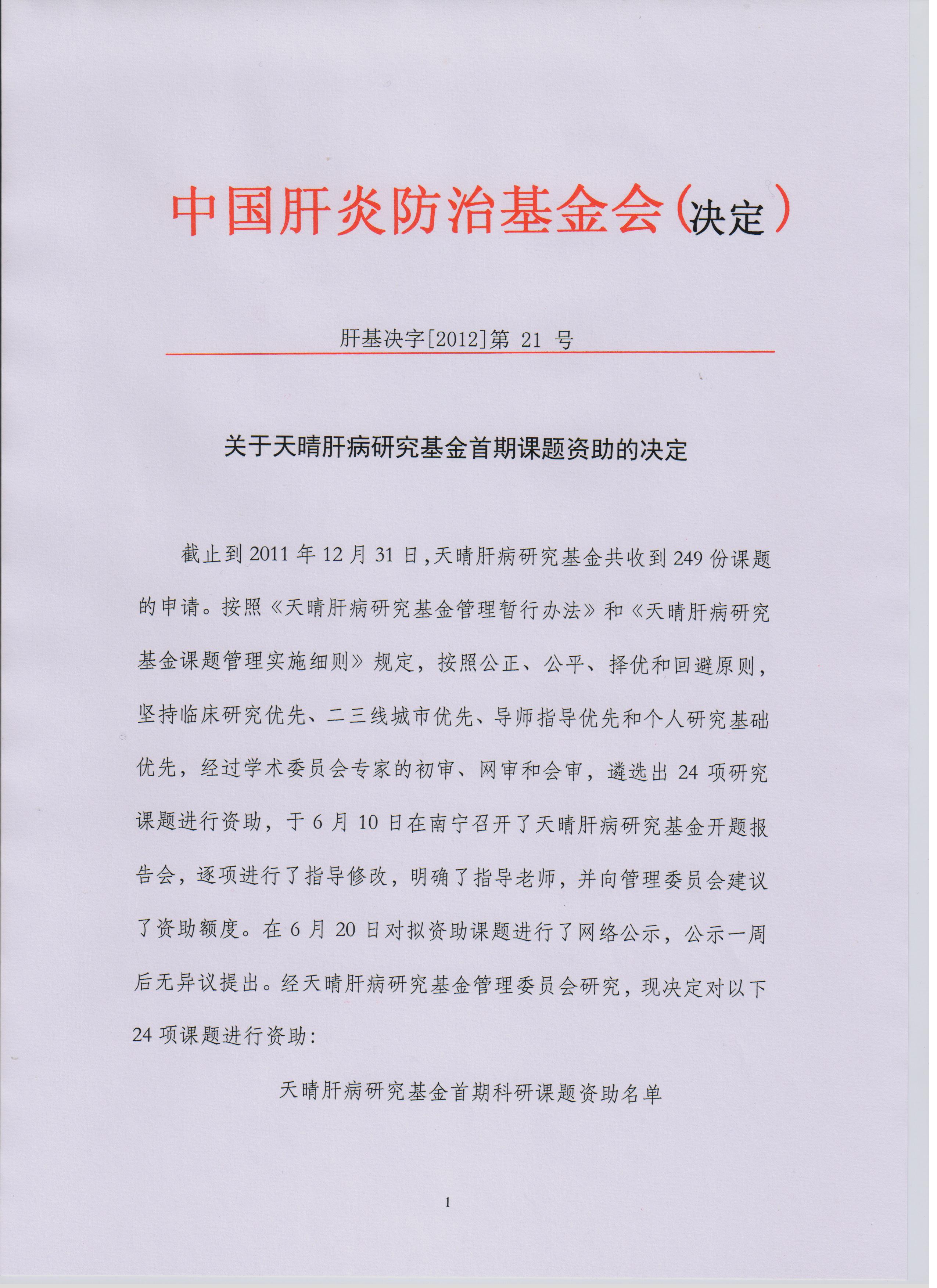 关于天晴肝病研究基金首期课题资助的决定